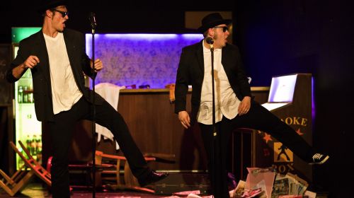 Die durchgeknallte Geschichte, die Iris Matzen (Text und Regie) für die Uraufführung im Theater der Keller erfunden hat, dient freilich in erster Linie als Rahmen für eine Nummernrevue. Das Konzept ist dramaturgisch dünn und zeigt gewisse Anlaufschwierigkeiten. Getreu der später dargebotenen Elvis-Forderung „a little less conversation, a little more action please“ gewinnt der Abend jedoch an Fahrt, je weniger bloß geredet und je mehr gesungen, getanzt und herumgealbert wird. Das erwartet man von einer selbsternannten „testosteronbeladenen Doppelgängerkomödie“, das können die beiden Darsteller wirklich ausgezeichnet. Frank Maier und Hagen Range sind so in Fahrt, dass der Schweiß in Strömen fließt und auch das Publikum zunehmend in Wallung gerät. Neun Songs werden in dem gut eine Stunde kurzen Stück geschmettert, die Qualität variiert. Knaller sind Maiers Campino-Imitation und Ranges Westernhagen-Röhre oder das Blues-Brothers-Finale. Zwei sympathische Komödianten in einer heiteren Show, die sich gut zum musikalischen Vorglühen an einem Abend mit geplanten Partyaktivitäten eignet.