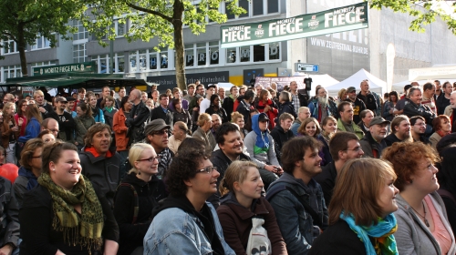 Neben den drei Musikbühnen ziert zum dritten Mal die trailer-Wortschatzbühne die Passage entlang der Viktoriastraße zwischen der WAZ-Bühne und der Marienkirche. Hier ist es etwas leiser, mit weniger Lichteffekten, dafür aber reichlich Ausdrucksstärke. Wenn die Musik auf den großen Bühnen verstummt, fallen hier die ersten Silben der Wortkünstler.