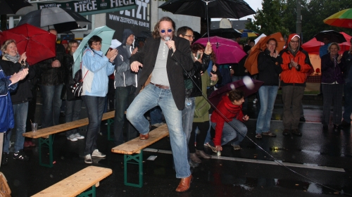 Im Gegensatz zum dem bei Andreas Oberings Auftritt. Am Sonntag poltert der besser unter dem Namen „Der Obel“ bekannte Kabarettist mit lockeren Sprüchen und platten Gags in typischer Ruhrpott-Manier. Er immitiert Ozzy Osbourne und scheut nicht davor zurück, bei Dauernieseln ins Publikum zu laufen. Dabei wurde die bedenkliche Qualität der Texte mit seinem Auftreten als Rampensau einigermaßen wett gemacht. Wie die meisten Künstler zählt auch "Der Obel" zu der Auswahl von BosKop, dem Kulturbüro des Akademischen Förderungswerkes.