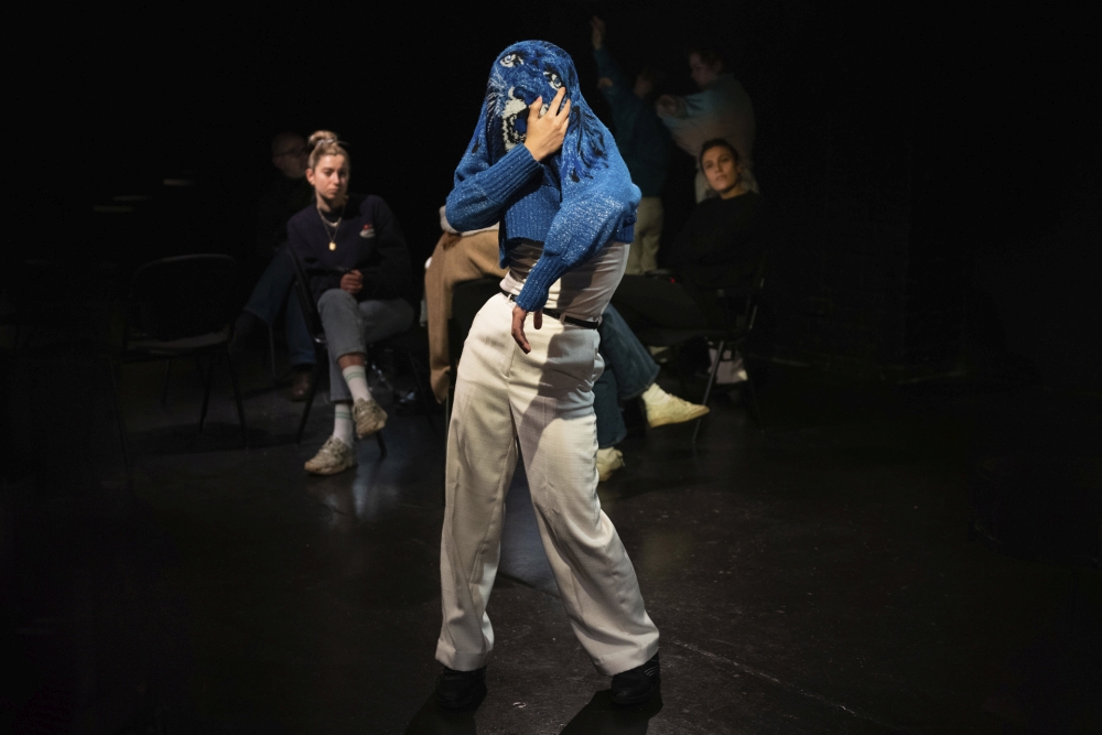 Man liegt nicht falsch, wenn man als Anregung Hartmut Rosas große philosophische Studie von 2016 vermutet. Die Zuschauer:innen nehmen auf Stühlen Platz, die um kleine, magisch von innen beleuchtete Snaredrums gruppiert sind. Katharina Sim, Fiona Metscher und Jimin Seo eilen durch den Raum und hören die Wände ab: „Ich glaub, ich hab den Ton gefunden“. Sätze wie „Resonanz ist die Sehnsucht nach einer Welt, die einem antwortet“ oder „Es muss doch möglich sein, anders in die Welt gestellt zu sein“ deuten an, dass es nicht nur um eine „Soziologie der Weltbeziehung“ geht, wie es bei Rosa heißt, sondern dass darin ein zutiefst utopisches Potential gegen den Kapitalismus als Lebensform beschworen wird. Resonanz ist ein dehnbares Phänomen, das sich als Beziehungsmodus auf schlicht alles, von der Natur über Covid, Migration bis zur Ding-Welt, übertragen lässt.
