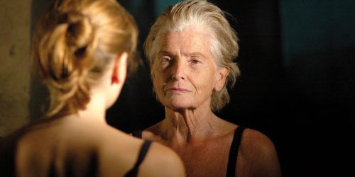 Zwei Frauen: Beide tragen sie blaue Leggings, Spaghetti-Träger-Shirts und Ballerinas. In einer späten Lebensphase die Eine, dem Teenager-Alter eben entwachsen die Andere. 50 Jahre liegen zwischen ihnen. Hier das gelebte Leben, dem Körper eingeschrieben, dort die glatte Haut der Jugend. Betty Blaeser und Celina Rongen begegnen sich neugierig, fragend. Tastend ziehen sie die Gesichtszüge der jeweils Anderen nach, sind sich Spiegelbild und buchstäblich Projektionsfläche.