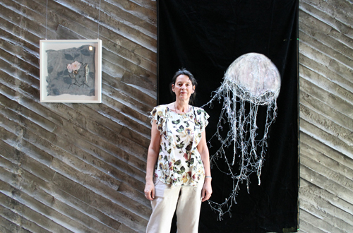Ganz befreit und nahezu ohne Bindung an eine festgeschriebene Form schwebt die Arbeit „Medusae“ schillernd auf samtigem Schwarz, zieht Fäden nach sich, wie sich windende Tentakel durch den Stoff. Ein Astronaut verliert sich in „Freier Fall“ am Goldfaden in der Unendlichkeit.