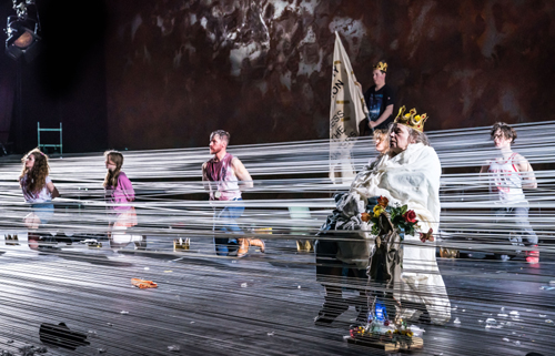 Dass trotz Konsum nicht nur die sozialen Klassen getrennt bleiben, sondern vermutlich auch ihr jeweiliges Bildgedächtnis, macht auf geniale Weise das Bühnenbild von Olaf Altmann deutlich. Nach hinten wird die Spielfläche von einer gewaltigen rostigen Metallwand abgeschlossen, die als Klagemauer, als Trommel- oder Gefängniswand dienen kann. Nach vorne wird die Bühne durch ein bühnenbreites Gewebe aus horizontalen Seilen abgeschlossen, die an einen Webstuhl, das gesellschaftliche Geflecht oder die soziale Leiter denken lässt. Immer wieder hängen Figuren darin fest, klettern in dem Gewebe herum, wechseln zwischen Vorder- und Hintergrund hin und her wie die Angestellten bei Dreißiger. Je mehr die Wut der Weber wächst, desto tiefer senkt sich die Faden-Wand herab. Mit dem Aufstand und der Erstürmung von Dreißigers Villa jagt der Bewegungschor dann ikonografische Bilder des Aufstands und Protests durch die Wahrnehmung: die nackten Hintern der K1-Kommune, Delacroix‘ „Die Freiheit führt das Volk“, Mauersprung-Fotos. Petras‘ Interpretation spielt auch mit der Frage der Ikonografie und ihrer Nachwirkung: Es bleiben Bilder der Geschichte, die auf einen neuen Bildersturm der Revolution warten. Am Ende setzen sich die Weber goldene Kronen auf. Jeder König steht in seiner eigenen Ackerfurche des Daseins, die die Seile der niedergelegten Wand vorgeben. Von einem Kollektiv fehlt jede Spur. Petras versagt sich weitgehend Momente des Mitfühlens; am nächsten kommen dem noch Ansorges (Ursula Werner) große Klage im zweiten Akt oder die quicksilbrigen Kommentare des Lumpensammlers Hornig (Katharina Schmalenberg). Hauptmanns Stück wird eher zu einem abstrahierenden Denkraum, der anschlussfähig wird für Assoziationen und zeitgenössische Analysen – und gerade deshalb sehenswert ist.