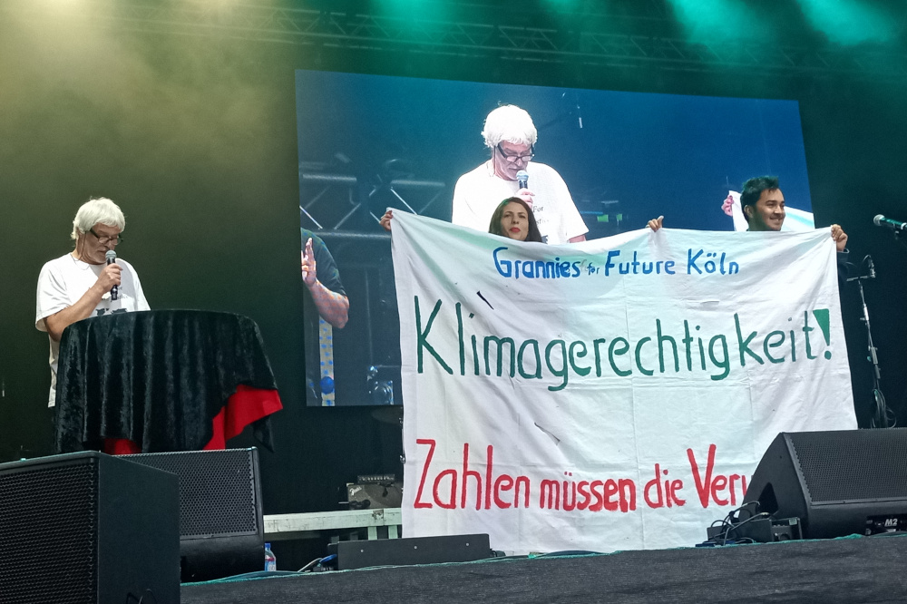 Gelassen und humorvoll führen die Moderatorinnen Negah Amiri und Marie Knäpper durch das vielfältige Programm und holen Angehörige verschiedenster Generationen auf die Bühne. Bevor der 25-jährige Fridays For Future-Aktivist Amadeo Kaus mit Rheinenergie-Vertreterin Kerstin Bürker über politische und unternehmerische Versäumnisse in Sachen Klimaschutz diskutiert, hält der 70-jährige Dieter Gehringer eine ausdrucksstarke und gut recherchierte Rede über Klimagerechtigkeit. Der Mitgründer der Grannies for Future Cologne erscheint in einem T-Shirt, das er bewusst für diesen Anlass gewählt habe. Es trägt den Aufdruck: „Act now for Climate Justice“. Neben ihm halten Kaus und Knäpper ein Transparent hoch: „Klimagerechtigkeit! Zahlen müssen die Verursacher“. Letzteres stamme aus dem Jahr 2022, das T-Shirt habe er schon 2016 von einer Tanztheater- und Akrobatikgruppe aus Tansania erhalten. Klimagerechtigkeit sei also ein Thema, das bereits älter ist als die For Future-Bewegungen. Erstmals in den 1990er Jahren habe der Native American-Aktivist Tom Goldtooth die Forderung nach Klimagerechtigkeit formuliert. In erster Linie verantwortlich für den menschengemachten Klimawandel seien wir: der globale Norden. Die Folgen tragen müssten jedoch vor allem die Menschen im globalen Süden. Pro Kopf berechnet wäre Deutschlands CO2-Budget (IPCC) im Jahr 2031 verbraucht. Indien hätte Zeit bis 2079. Historische Emissionen mitgerechnet, hätten wir unser CO2-Budget sogar längst verbraucht. „Das Verursacher-Prinzip verlangt auch, dass die Haupt-Verursacher des Klimawandels für die Kosten für Anpassungs-Maßnahmen und klimabedingte Schäden in Ländern des globalen Südens aufkommen müssen“, betont Gehringer. Und genau das meint die Parole auf dem Transparent.
