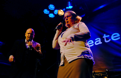 Der Saal im Artheater ist vollgestopft. Schuld sind sie: Gerd Buurmann und Hildegart Scholten, die am 8. Mai zum nunmehr 507. Mal zu „Kunst gegen Bares“ einluden, um das Kapitalistenschwein der Woche auszumachen. Das erste mögliche Schwein ist Christian, der mit Gitarre auf die Bühne hüpft, auf der er zuvor noch nie gewesen ist, und der sich geheimnisvoll „Dura-Cis“ nennt, wahrscheinlich, weil sein Nachname „Heil“ in Deutschland etwas schwierig werden könnte, wie Hildegart umgehend feststellt. Überhaupt ist die Komikerin an diesem Abend wunderbar herzlich und mitfühlend. So flirtet sie gelegentlich Männer aus dem Publikum an, leicht aggressiv werdend, wenn diese nicht zurückflirten, oder knallt einem Ehepaar um die Ohren, warum sie so viele Kinder hätten, sie hätten wohl zu viel gebumst. Hilde nimmt kein Blatt vor den Mund.