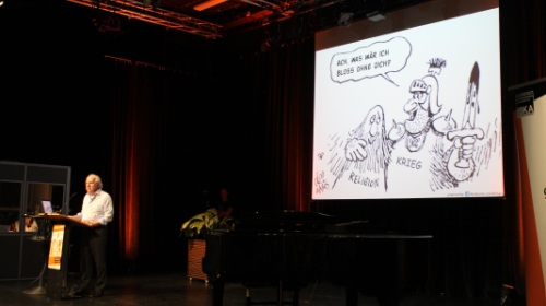 Inhatlich waren sich die Teilnehmer weitgehend einig: „Religion wirkt auf kriegerische Konflikte wie Brandbeschleuniger“, wie es der Autor Carsten Frerk in seinem Vortrag formulierte. Religion stifte Unruhe, vor allem, wenn sie mit Politik vermengt werde – die beste Chance auf Frieden verspreche daher eine säkulare Regierung, argumentierte Dan Barker. Dass die meisten Religionen eine starke Friedensethik hätten, ließ er dabei nicht gelten: „Gerade im Christentum ist Frieden etwas, das den Menschen von oben zuteil wird – nachdem man aufgegeben und sich Gott unterworfen hat. Wahrer Frieden aber entsteht nur aus freier Entscheidung“.
