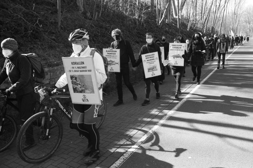 Starke Bilder gelangen XR Wuppertal zum Artensterben auch friedlich. Im Frühjahr 2021 zog zweimal eine Art Trauerzug über die Nordbahntrasse: Schwarz gekleidete Aktivisten trugen einen Sarg und beklagten auf Schildern die Gefahr für bedrohte Arten – und den Tod schon ausgestorbener, wie des Chinesischen Flussdelfins oder Spix-Aras. Auf der stark frequentierten Trasse in Höhe der Utopiastadt bis zum Loher Bahnhof war dem Marsch einige Wahrnehmung sicher, die man auch zum Unterschriften-Sammeln für die „Volksinitiative Artenschutz NRW“ nutzte.