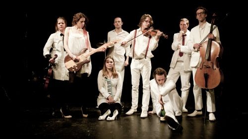Der Star des Abends − so denkt man vielleicht − ist natürlich August Diehl. Der sonst so sprachgewandte Schauspieler schweigt aber und überlässt Hans Narva die Moderation. Diehl ist ganz in sein Gitarrenspiel vertieft, manchmal schaut er rüber zu seiner Frau Julia Malik − ebenfalls Schauspielerin. Narva, Mitglied der einstigen DDR-Band „Herbst in Peking“, hat eine unaufdringliche Stimme, die den Streichinstrumenten genügend Raum lässt. Keine Frage, er ist eine Type, wie man in Berlin sagen würde. Vor zwei Jahren wurde er deshalb zum Protagonisten von Claudia Lehmanns Dokumentarfilm „Hans im Glück“. Aber eine Rampensau ist er nicht. Und das ist das Schöne an dem Auftritt von „Hands up – Excitement!“: die sechs Musiker sind gleich stark.
