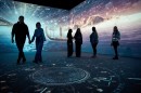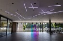 Von der Decke hängende, LED-beleuchtete Acrylglasröhren interagieren mit Skulpturen, die vom Boden aufsteigen und das Foyer gliedern. Bis auf weiteres in Köln zu sehen.