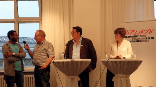 „Mittwochsgespräche“ hieß in den 1950er Jahren eine Veranstaltungsreihe in einer Buchhandlung im Kölner Hauptbahnhof. Nach dem Zweiten Weltkrieg wurde hier die politische Debatte (wieder)belebt, was teilweise in heftige Diskussionen mündete. Auf diese Tradition verweisen die Lektoren Lutz Dursthoff und Helga Frese-Resch vom Verlag Kiepenheuer & Witsch, die einen Diskussionsabend im Rahmen von Birlikte moderieren – im Verlagshaus mit Blick auf den Kölner Hauptbahnhof. Großen Gesprächsbedarf erkannten die Mitarbeiter angesichts der politischen Lage, den Berichten toter Menschen im Mittelmeer und der durch Medien überlieferten Stimmung im Land. „(Wie) Können wir zusammen leben?“ heißt nun die Veranstaltung, die interessierte Besucher mit Aktiven der Kölner Willkommenskultur wie Pfarrer Hans Mörtter und mit Geflüchteten zusammenbringt.