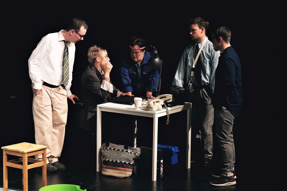 Der mittlerweile 14. Inszenierung des inklusiven Ensembles die Attitüde der Komödie anzuheften, wird dem Werk aus der Feder von Ulrich Marx jedoch nicht gerecht. Vielmehr offenbaren sich hinter jedem Lacher tragische Züge, die das Kollektiv bestehend aus Menschen mit und ohne Behinderungen mitunter kurz anleuchtet, dann mit verdunkelten Scheinwerfern in ein dämmriges Seelenlicht taucht. Einsamkeit, Isolation oder Befremden schleppen sowohl die vermeintlich sonderbaren Interviewpartner als auch die Journalisten wie Blei-Schatten durch ihr Dasein. Deren Arbeit ist im Angesicht der prekären wirtschaftlichen Verlags-Situation und ihrer eigenen Stellung im Betrieb von Zweifeln gekennzeichnet.