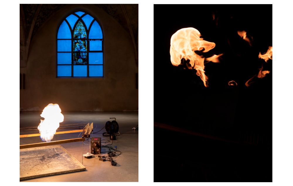 Wenig passiert im Halbdunkel des Kirchenschiffes, aber wenn man lange und konzentriert innehält, ist das sehr viel und bereichernd. Auf dem Boden befindet sich eine technische Apparatur, karg und funktional mit ihren parallel gespannten elektrischen Drähten. Der Bereich der Hochspannung ist abgezäunt, man hört eine Entzündung und ein Knarzen und sieht anschließend eine Seifenblase, die Gas in sich trägt und von der Empore nach unten schwebt. Das eine Mal landet sie daneben, dann aber trifft sie auf den Drähten auf: Mit einem Knall und für einen Moment bildet sich in der Luft eine Feuerzunge.