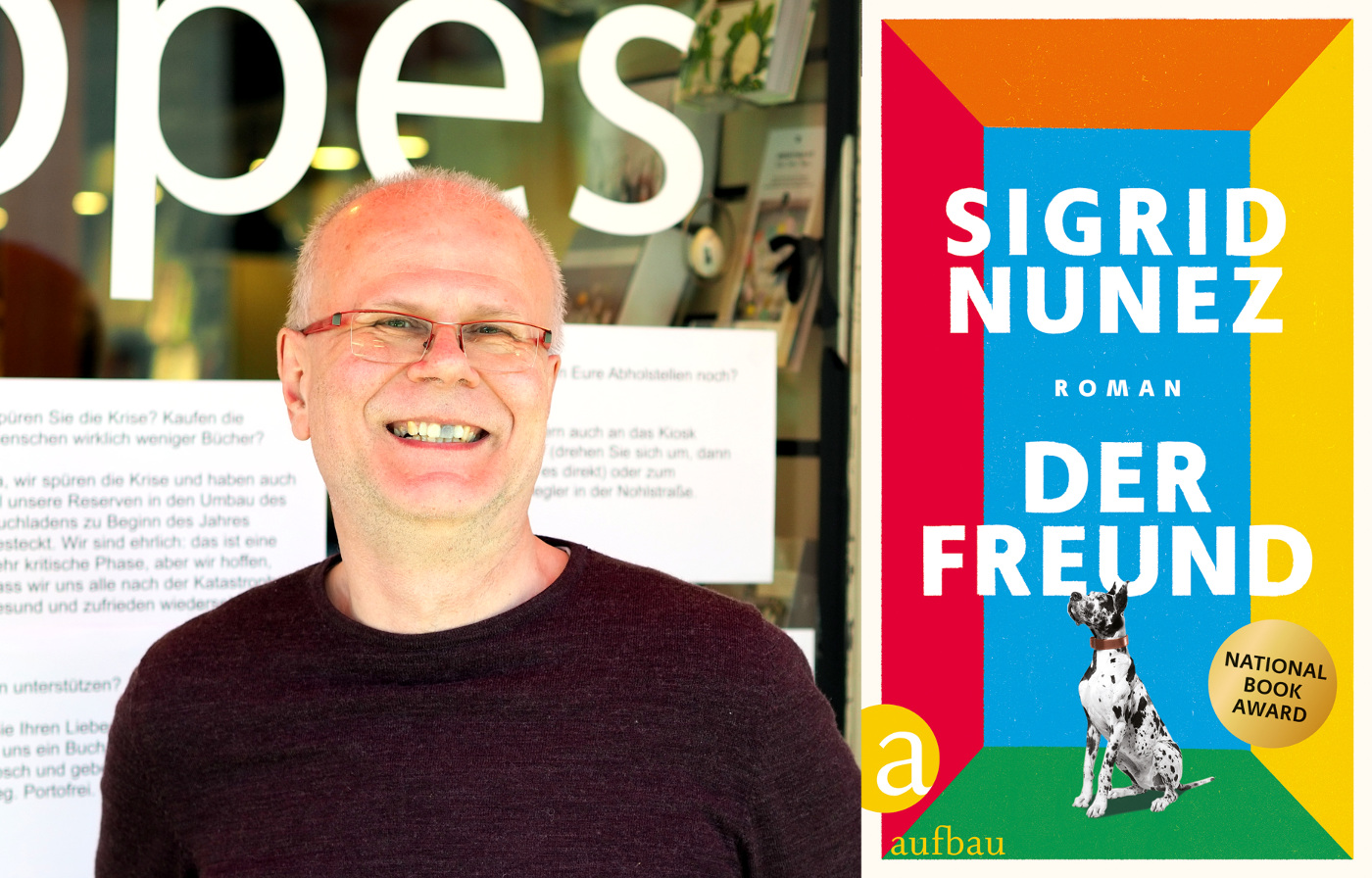„Es gibt in diesem Frühjahr wirklich ein paar wunderbare Bücher, zumeist von Autoren, die man vom Namen her nicht unbedingt kennt“, erklärt Guido Krey und nimmt den Roman „Der Freund“ (Aufbau, 2020) von der Auslage. „Einer dieser Fälle ist Sigrid Nunez, eine amerikanische Autorin, schon jenseits der 60. Sie hat vor anderthalb Jahren dafür in den USA den National Book Award gewonnen. Es ist ein wunderbares Buch, es geht um Trauerbewältigung, um die Literatur. Es wird in der ersten Person Singular erzählt: Eine Frau trauert um einen Freund, der sich umgebracht hat – sie reflektiert sein Leben. Er war ein Literaturdozent, sie selbst schreibt sehr viel über Schriftsteller, deren Marotte, was Literatur für eine Funktion hat. Und eine andere Geschichte ist, sie erbt von einem Freund eine riesengroße dänische Dogge, und sie wohnt in einer mietpreisgebundenen Wohnung in New York, wo man keine Haustiere halten darf. Was bei einer 80 Kilo schweren Dogge schwer zu verheimlichen ist.“