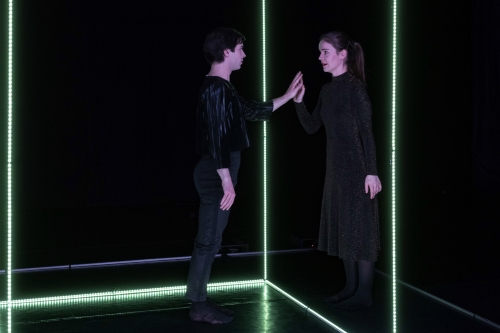 Elektronische Musik untermauert die choreografische Performance der Physical-Theatre-Gruppe. HuWoman, menschlich, durch ihren Alltag getaktet und polyamorös verstrickt, tritt in einem LED-Lichterschlauchkubus mit Karen, künstlich-intelligent-aufdringlich, in Interaktion. Zunächst auf virtueller Ebene über ein Smarthomesystem, schließlich mithilfe des Features „Live Life Experience“ von Angesicht zu Surface. So wird aus Karens körperloser Stimme ein Buddy mit Body. Die Begegnung entpuppt sich zunächst als entlastend. So hat HuWoman plötzlich Zeit, sich Gedanken zu machen. Über die Möglichkeit einen Aquarellmalkurs zu belegen zum Beispiel. Dass in dieser Leere auch eine Krise steckt, wird deutlich, als sie aus ihrem goldenen Käfig ausbricht und rebelliert. Gegen Karens Optimierungsvorschläge verteidigt sie ihr „Recht auf die eigene Beschissenheit“.