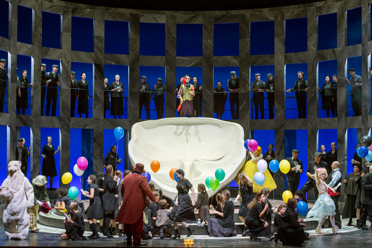 In Bonn setzt Montavon die beiden Eifersuchtsdramen in einem schlichten, aber dennoch effektvollen Bühnenbild von Hank Irwin Kittel in Szene, das dominiert wird von den beiden überdimensionalen Totenmasken der beiden Komponisten, die zwischenzeitlich sogar als Bühne dienen. Wirkt der Hintergrund in der Cavalleria noch wie eine italienische Urnen-Gräberhalle mit den einzelnen Kassetten, so sind diese im Bajazzo durchbrochen und bieten Raum zur Durchsicht – oder auch zum Versteckspielen und Belauschen. Auch in der Ausstattung bleibt es realistisch bis hin zum schillernden Treiben der Schauspieltruppe des Bajazzo mit viel Pomp und Schaukel – ganz an den Verismo angepasst.
