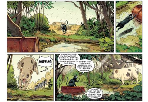 Wie kriegt man es hin, ein kleines Schwein so zu zeichnen, dass es nicht unglaublich niedlich ist? Wie kann es sein, dass ich einen Comic voller niedlicher Tiere lese, und nicht bei jedem Panel vor Verzückung quieke? Indem man ihnen, dem Schwein, den Igelchen, dem Eichhörnchen und auch den weniger herzigen Lebewesen menschliche Züge verleiht. Denn die hässlichsten Gestalten sind, obwohl sie selten als mehr als gesichtslose Statisten dargestellt werden, die Menschen selbst. Ihr Handeln und ihre Werke sprechen für sich. Das Menschliche macht hässlich. Man könnte dies als eine Botschaft des Comics „Arche Neo“ ansehen und das wäre nicht falsch.