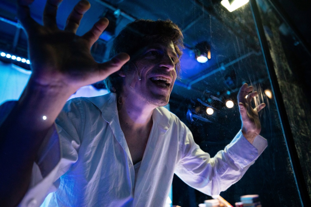 Doch der Schauspieler Bernhard Dechant liegt erstmal einsam hinter einer bühnenbreiten Plexiglaswand in einem Kämmerchen mit Bett, Schreibtisch und Stuhl, Spitzweg und Freelancer – bis endlich Regisseur Kieran Joel simst und damit Erlösung naht. Doch das eingeblendete Gesimse hat eher etwas von Hinhaltetaktik, Verfehlung und Demütigung. Dechant verbeißt sich in den Text und steigert sich allmählich in Artauds mystische Beschwörung hinein. Er schleudert die Sätze heraus, spuckt und malt mit Blut Schriftzeichen an die Scheibe – eine Form der sukzessiven Verausgabung, die einer Anverwandlung von Artauds eigenem Schauspielstil gleicht.