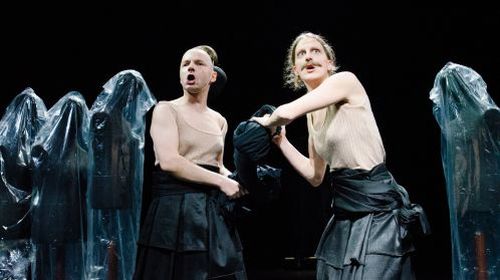Wie sich die beiden zu Beginn sprechend aus der Dunkelheit lösen und sich inmitten von 18 schwarz verhüllten Kleiderpuppen nicht von diesen unterscheiden, ist ein großer Theatermoment. Andrea Bleikamp und ihr Ausstatter Claus Stump entwerfen in der Folge eine klaustrophobische Atmosphäre in einem strengen Schwarz-Weiß. Die Kleiderpuppen demonstrieren die Macht der Gesellschaft ebenso wie religiösen Fundamentalismus, der den weiblichen Körper den Blicken der Öffentlichkeit entzieht.