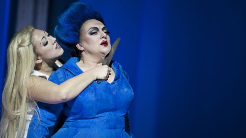 Letztlich sind es allein die schrillen, brachialen Farbcodes, die den Kern der Inszenierung ausmachen. Da macht es nichts, wenn dem Zuschauer bei einer Aufführungsdauer von gut zweieinhalb Stunden zuzüglich Pause einmal die Augen zufallen – er verpasst nicht viel, solange er die Ohren offen behält. Die Wasserwesen sind blau, die Menschen gelb – und weil es in der höfischen Welt Letzterer ständig sexuell aufgeladen zugeht, laufen sie in roten Stiefeln und Strumpfhosen herum, den Lippenstift so dick aufgetragen wie Batmans böser Joker. Eine Handvoll Schnappschüsse würde reichen, diese Bildersprache zu vermitteln. Bewegung ist in dieser Inszenierung ohnehin Mangelware, die Personenführung dürftig.