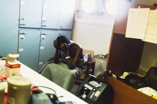 Im dritten Ausstellungsraum sind Fotografien des jungen Künstlers Sinawi Medine zu sehen, der selbst Flüchtling aus Eritrea ist. Er hat im März und April 2016 die Hilfsaktion des Rettungsbootes „Aquarius“ begleitet und fotografisch dokumentiert. Viele seiner Werke sind in Schwarz-weiß fotografiert, ein Aspekt der die Not und das Elend der Menschen besonders hervorhebt. Auch ein Kleinkind ist an Bord des Rettungsbootes. In den Armen seines Vaters blickt es aus einem Guckloch des Schiffs in die ungewisse Zukunft. Mit einem Fokus auf den Mikrokosmos eines einzelnen Rettungsbootes, unterstreicht Medine das schwere Schicksal und das damit verbundene Leid jedes einzelnen Flüchtlings. Während des Betrachtens der Fotografien wird einem bewusst, dass solche Rettungsboote jeden Tag aufs Neue unterwegs sind und dass das Meer immer unberechenbar und gnadenlos bleiben wird.