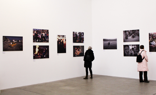 Geremia Carrara und Francesca Magistro haben Menschen fotografiert, die bereits angekommen sind. Diese Geflüchteten haben ein neues Leben als Musiker begonnen. Ganz anders geht es denjenigen, die auf den Fotografien der Werkreihe „Das nackte Leben – Flucht und Vertreibung im 21. Jahrhundert“ im nächsten Ausstellungsraum zu abgebildet sind. Christoph Püschner und Frank Schultze, zwei deutsche Fotojournalisten, zeigen in Arbeiten aus den letzten 20 Jahren, dass es Flucht schon seit langem gibt. So kann man hier die Fotografie einer alten tschetschenischen Dame betrachten, die wie gelähmt neben einer zerstörten Gasleitung sitzt. Sie wirkt völlig allein gelassen und verloren. Eine andere Fotografie zeigt den jungen Ochola Jhon aus Uganda in Nahaufnahme. Die Bildunterschrift erzählt von seinem Schicksal: Ochola wurde fälschlicherweise für einen Soldaten der Regierungsarmee gehalten, von LRA-Rebellen verschleppt und von Kindersoldaten mit Macheten verstümmelt. Nach einiger Zeit konnte er fliehen und lebt mittlerweile zusammen mit seiner Familie in einer armseligen Hütte.