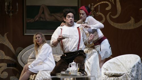 Alles ist nur ein Spiel – die erfundene Adelsgesellschaft mit ihren erfundenen Bräuchen und auch der Liebesreigen, in den die nicht mehr ganz so junge und desillusionierte Feldmarschallin mit ihrem jugendlichen Liebhaber, dem derb-lüsternen Cousin und seiner blutjungen Braut gerät. Regisseur Philipp Harnoncourt ließ sich von dieser Ausgangslage zu einem Theater auf dem Theater inspirieren, das durchaus gut funktioniert.