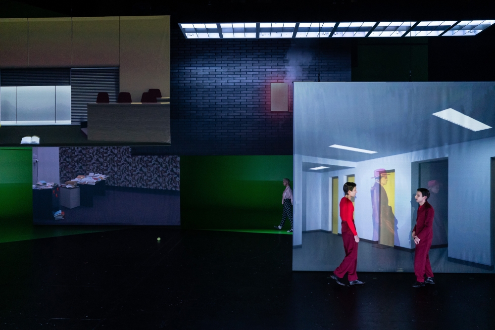 Regisseurin Pinar Karabulut hat Franz Kafkas Roman „Der Prozess“ für die Bühne dramatisiert und vervielfacht von Beginn an die Hauptfigur Josef K. – nicht nur mit dem Darsteller-Duo Alexander Angeletta und Bekim Latifi, sondern auch mit vier weiteren Darstellerinnen. Deutlich wird das durch eine identische Kostümierung mit einem knallroten Sci-Fi-Anzug (Kostüme: Teresa Vergho), der Erinnerungen an das Cover von Kraftwerks „Mensch-Maschine“-LP weckt. Diese Setzung hebelt die theatrale Emotionsmaschine gleich zu Beginn aus und erschwert Identifikation oder Empathie erheblich – nimmt aber die Verkürzung Josef K. ernst.