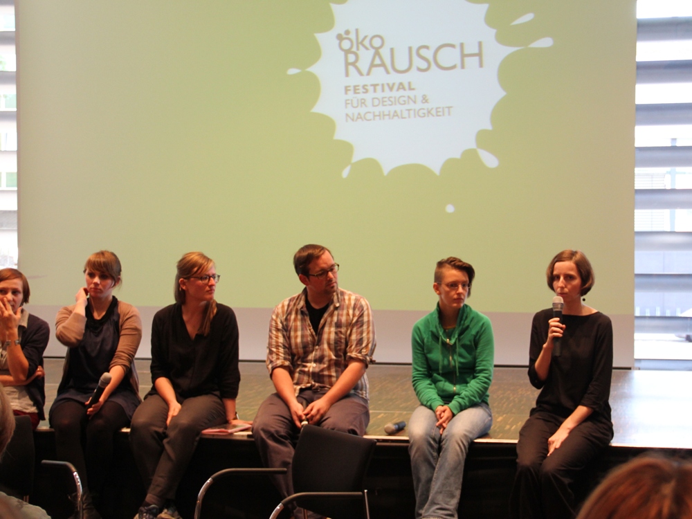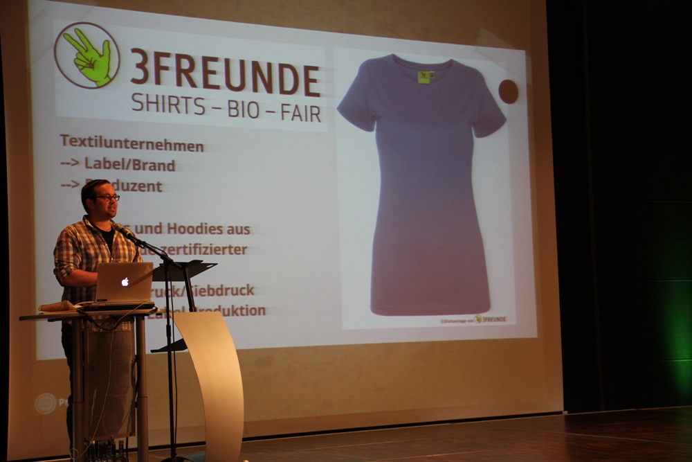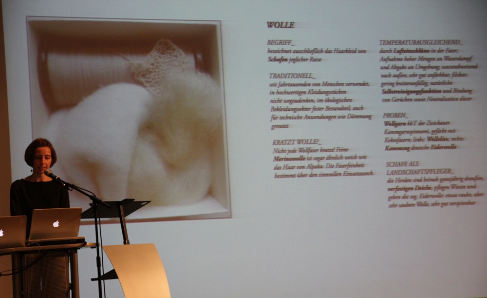Katharina Jebsen (Master of Conceptional Textile Design) führte bei ihrem Vortrag über alternative Materialien in die Welt der Textildesigns ein: Neben traditionellen Materialien wie Wolle stellte sie auch unbekanntere, neuere vor: Milchfaser beispielsweise. Milchfaser wird aus Kasein, einem technischen Milcheiweiß gewonnen und bringt einige Vorteile, wie Nachhaltigkeit und antiallergische Eigenschaften, mit sich. Dieses Weiterdenken in textilen Zusammenhängen, das Vorantreiben von Materialentwicklungen und Überschreiten von Grenzen reize derzeit viele Textildesigner. Vielleicht haben es gerade die Designer in der Hand, die zukünftige Materialwelt zu bestimmen und ein Stück weit auch zu revolutionieren. Ein weiterer Redner, Ralpha Breyer, arbeitet bei „3FREUNDE", einem Online-Shop für Fair Trade Kleidung. In seinem Vortrag sprach er über die Möglichkeiten, Bedingungen und langfristigen Ziele einer nachhaltigen, ökologischen und fairen textilen Kette. Als Mitarbeiter von 3FREUNDE kennt er die vielgliedrige textile Kette, die für den Verbraucher oft sehr undurchsichtig erscheint.
