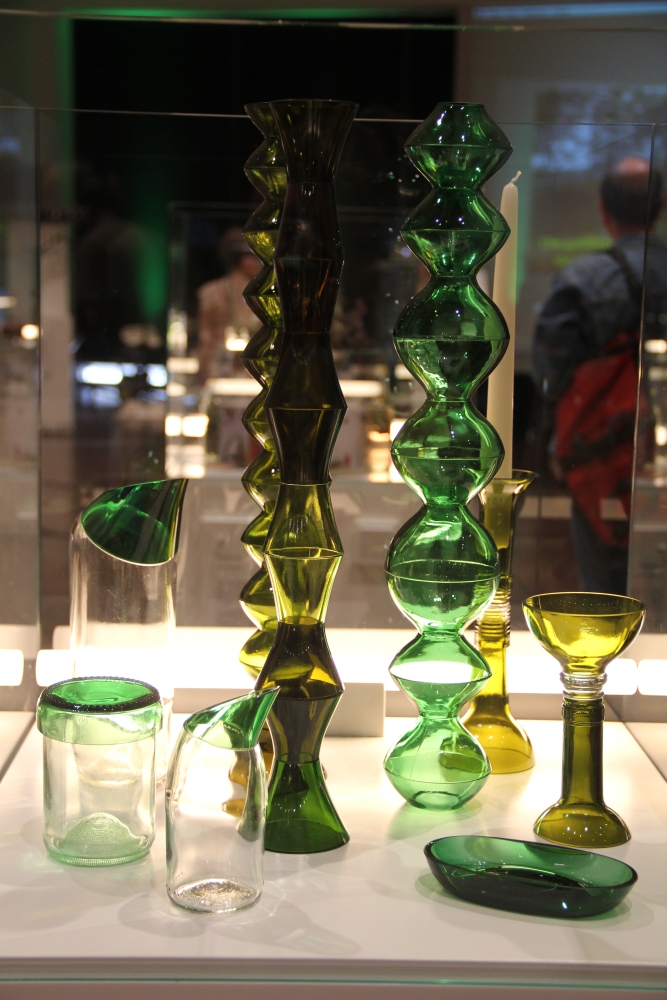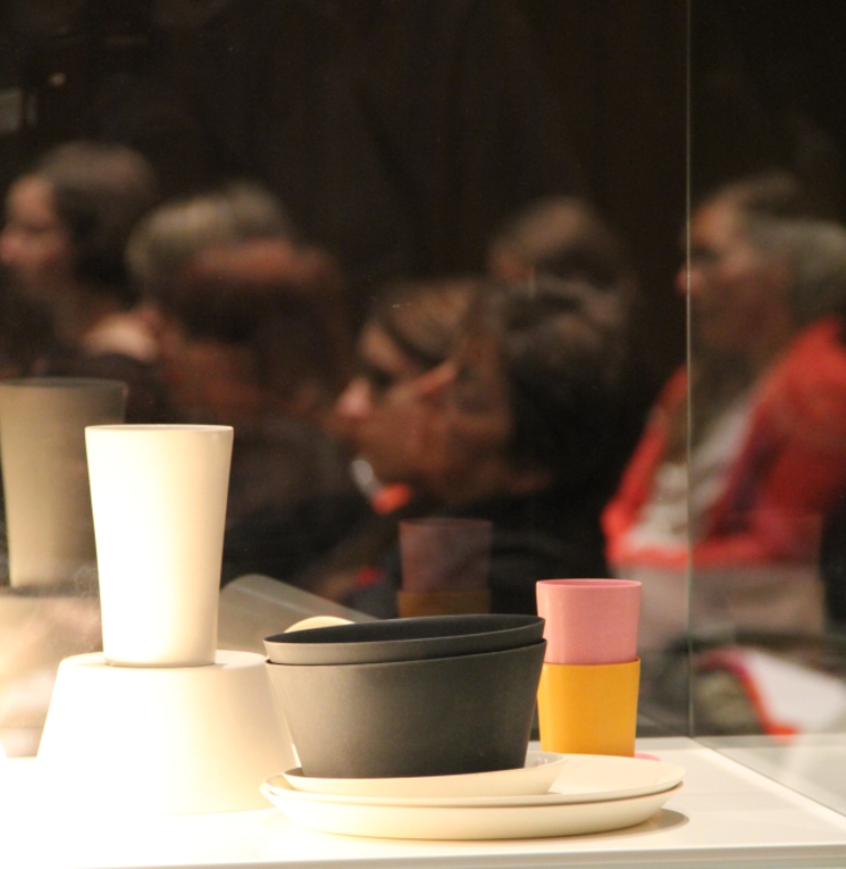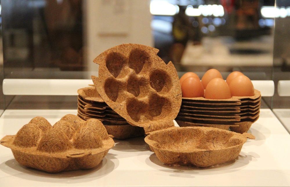 Mit den Flaschen von dopper. kann man Plastikmüll vermeiden, Geld sparen und zusätzlich Wasserprojekte in Nepal unterstützen, da sie wiederverwendbar ist. So entsteht nicht dauernd neuer Müll durch Plastikflaschen mit geringer Lebensdauer. In die Körbe der Initiative „HoliCOW", die in Zusammenarbeit von Designern und philippinischen Flechthandwerkern entwickelt wurden, finden Habseligkeiten ihren Platz: Die Körbe wurden, inspiriert von traditionellen Handwerkstechniken, aus indigen Materialien hergestellt und designt. Die hübschen, grünen Gläser von Sybille Homann, die aus recycelten Flaschen hergestellt werden, kann man auch als Vase auf den Tisch stellen. Das Changieren der Farben entsteht durch den Prozess der Wiederverarbeitung. Das Geschirr „8pandas" ist aus einem ungewöhnlichen Material hergestellt: Es besteht zu 100 % aus dem nachhaltigen Material Bambus. In der Küche bleiben die Eier in der wiederverwertbaren und biologisch abbaubaren Kokosnussfaser-Verpackung von NFC Design geschützt. Für Leckermäuler stellt „Kräuterkauz“ Eingemachtes aus regionalen Kräutern und Früchten her und will durch die angebotenen Bildungsveranstaltungen Menschen für heimische Wildkräuter und die Natur sensibilisieren.