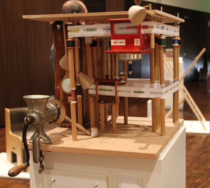 Kunst ist seit jeher prädestiniert dafür, Umdenken in den Köpfen zu bewirken: Das interaktive Kunstobjekt „The Promt Questionator PKL-20349“ besteht aus Ready-made Elementen und regt zum Nachdenken über Ökologie, Design und wirtschaftliche und soziale Bedingungen für ein „gutes Leben“ an. Das futuristisch anmutende Gefährt ist ein pädagogisches, erlebbares Kunstobjekt von Paul Ketz namens „Prometheus“. Ketz hat aus ausgemusterten Dingen eine Maschine erschaffen, die mit Feuer und Muskelkraft aus alten Plastikteilen neue Actionfiguren machen kann. Damit ist „Prometheus“ ein Kunstobjekt, das das Selbermachen und Recyceln vergegenwärtigt. Marina vom Tauschring Köln sagt dazu: „Ich behaupte, es gibt keine nachhaltigen Produkte – nur nachhaltige Lebensstile. Am Anfang steht immer das Bewusstsein. Ich halte es für notwendig, Zusammenhänge und (Produktions-) Prozesse zu verstehen. Ich möchte mit dem Objekt zu der Bewusstwerdung beitragen, dass jeder schöpferische Macht besitzt und durch sein Handeln positiven Einfluss auf seine Umwelt nehmen kann.“