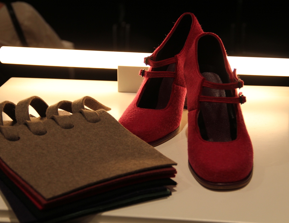 „Re-Felt" ist ein Beispiel für ein nachhaltiges Wertschöpfungssystem in der textilen Kette. Aus schlichten Konfektionsabfällen entsteht der Rohstoff für diesen Schuh aus Bio-Merinowolle.