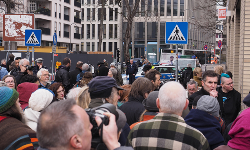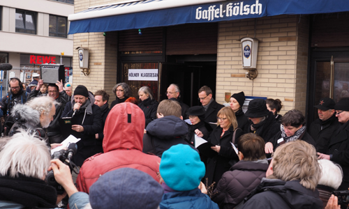 Die Kapelle „Trööt op Jück“ spielte vor der Absperrung, an der Trauerkränze aufgehängt sind, Blues und Trauermärsche. Ein schwarz gekleideter Chor und der Rapper Becks trugen unter der Leitung von Andreas Herzau vor der Kneipe „Papa Rudis“ einen „Kölner Klagegesang“ vor, geschrieben von Reinhard Matz und online nachzulesen, und um 13:58 Uhr wurde eine lange Schweigeminute abgehalten.