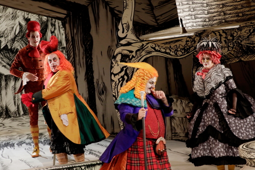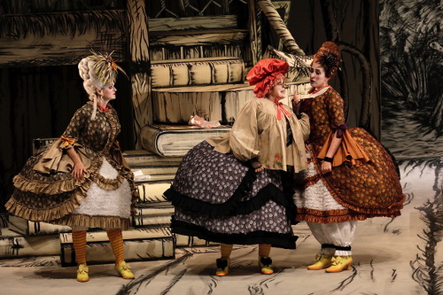 Die Akteure auf der Bühne sind sehr originell und farbenfroh gekleidet, die Damen tragen nicht nur bunte pompöse Krinolinen des französischen Hofes und haben mächtige Busen. Nein, sie bewegen sich auch im Hühnermarsch, scharren mit den Füßen, rupfen sich bei Kummer die Federn aus und bewegen den Hals nach Hühnermanier; auch die formulierten Übertitel machen den Spaß mit („Streithenne“ „Eingebildete Pute“). Die Herren bzw. die Hähne stehe dem in nichts nach: Hahnenkamm und Kehllappen, dominante Schwanzfedern und ein gockelhaftes Gehabe. Die zahlreichen Koloraturen und die begleitende Musik lässt schon an „Krach im Hühnerstall“ denken – vielleicht war das auch Intention von Cimarosa, menschliches Verhalten durch Tiere zu karikierten.