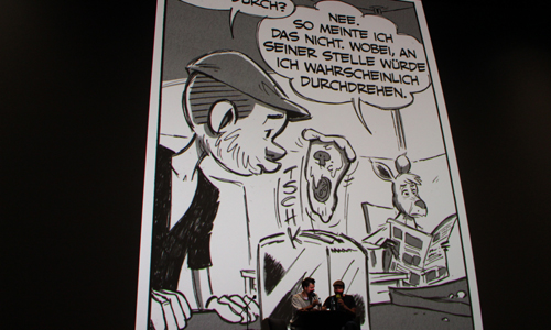 Ähnlich chaotisch ging es bei der anschließenden Comic-Lesung weiter, denn Marc-Uwe Kling merkte dazu gleich zu Beginn an: „Dimi liest mich, also Marc-Uwe Kling, damit es verwirrend ist, und ich lese das Känguru, weil ich’s gut kann.“ Nicht immer stimmte das Timing zwischen den Vortragenden auf der Bühne und der Einspielung der Comicbilder auf der großen Leinwand, aber auch dafür hatte Kling eine gewitzte Erklärung parat: „Technik ist eben die hässliche Schwester der Magie.“ Das Publikum im nahezu ausverkauften größten Saal des Cinedoms war dennoch begeistert und zollte den Künstlern mit Ovationen seinen Respekt. Kling wusste das zwar durchaus zu schätzen, hatte für die ZuschauerInnen hierzu aber auch einen Tipp parat: „Je mehr ihr klatscht, desto weniger Comics können wir vorlesen. Also weniger klatschen, sonst verliert ihr Zeit.“ Da Verschwörungstheorien im neuen Känguru-Film eine maßgebliche Rolle spielen, hatten sich Kling und Schaad dazu entschlossen, bei jeder ihrer Premieren-Performances auch einen Improvisationsteil zu Verschwörungstheorien einzubauen. Dafür baten sie das Kölner Publikum, ihnen ein Ding, eine Person oder Organisation, einen Ort, eine Zeit und ein Setting zu nennen. Die Wahl fiel dabei dann auf Flix-Bus, Wolfgang Kubicki, Kliemannsland, 1928 und ein Hinterzimmer. Aus dem Stegreif zimmerten die beiden Vollblut-Komödianten daraus einen witzigen Sketch, der mit der Entschlüsselung der Bedeutung hinter „Flix-Bus“ begann. Denn die Abkürzung hierin steht, laut dem Verschwörungstheoretiker Dimitrij Schaad, für „Frutarier der linken internationalen Exekutive“. Dieser 1928 in einem Hinterzimmer gegründete Verein besteht aus Mitgliedern, die sich ausschließlich von Obst ernähren. Kling schloss mit dem Kalauer, dass man mit ihrem bestgetarnten Doppelagenten und Mitglied Wolfgang Kubicki heizen könne, „weil er so viel heiße Luft produziert.“