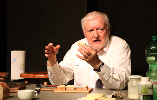 Peter Kubelka (83) wählt aus den aufgereihten Brotlaiben einen aus, schneidet mit einem Brotmesser eine Scheibe herunter, die er mittels Buttermesser dick mit Butter beschmiert und präsentiert das Ergebnis dem Publikum. Was simpel aussieht, erweist sich im Laufe des Abends als Parforceritt durch Kulturanthropologie und Menschheitsgeschichte. Kubelkas zentrale These: Das Herstellen eines Butterbrotes, generell das Zubereiten von Speisen, sei ein künstlerischer Prozess wie Malerei, Musik oder Dichtung. Der Medienkünstler erläutert uns: „Damit meine ich nicht die 5-Sterne-Küche, die fürs Auge, nicht aber für Mund und Geschmack produziert. Mir geht es um einfache Elemente und Traditionen. Es gilt, das Erbe der Menschheit zu nutzen.“ Für ihn ist das Butterbrot eine Metapher, die das Individuum im Hier und Jetzt verortet.