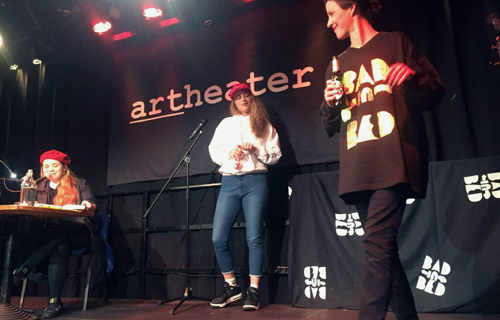 Auf der Lesereise wird sie begleitet von der Klitclique, zwei Raperinnen, die sie aus der satirisch-feministischen Burschenschaft Hysteria kennt, der auch das Buch gewidmet ist. Auch der Klitclique ist der ironisch gebrochene Ton nicht fremd, wenn sie über Cloudrap-Beats mit feministisch-dadaistischen Texten wandern. Nach dem Auftritt des Duos kommt Sargnagel auf die Bühne und beweist, dass sie mittlerweile Profi ist. Zielsicher und entspannt bringt sie ihre Pointen unter. Das Publikum hat sie schnell für sich gewonnen. „Ganz Deutschland liegt uns zu Füßen“, behauptet sie. Im April ist ein weiterer Auftritt geplant. Wieder soll es Literatur im Artheater geben. Wohl kann man davon ausgehen, dass Deutschland und Köln ihr weiterhin zu Füßen liegen werden.
