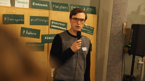 Marcel sprach für das im Oktober nach Hamburger Vorbild gestartete Welcome Dinner Köln, das Flüchtlinge mit Kölnern zu einem Abendessen zusammenbringe und über eine Webseite laufe: „Dort kann man sich anmelden, entweder als Gastgeber oder als Gast.“ Die Leute, die nach bestimmten Kriterien zusammengeführt würden, könnten zu einem späteren Zeitpunkt entscheiden, ob sie „dranbleiben und sich wiedersehen wollen“ oder nicht. „Wir haben bis jetzt schon 60 Dinner vermittelt.“ Die „Stories“ würden auf der Facebookseite und dem Blog verfolgt. „Was wir suchen, sind Leute, die uns helfen bei der Vermittlung“, denn Gastgeber gebe es derzeit genug. „Wir sind 15 Leute und wir sind alle echt nett.“