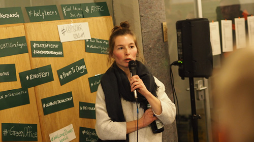Zum Thema Nachhaltigkeit fand sich Colabor-Mitbegründerin Katharina von Taste of Heimat am Mikro ein. Das aktuelle Projekt sei der „Kölner Ernährungsrat“, der im März gegründet werde, um die Beziehung zwischen Landwirten aus der Region und den Städtern – z.B. Kantinenbetreibern – herzustellen und Direkthandelsbeziehungen aufzubauen. Vor allem sei es auch ein Ziel, „das Thema Ernährungspolitik in die Region zurückzuholen. Ernährungspolitik wird auf EU-Ebene gemacht. Das geht bis zum Bund, und da hört es auf. Da, wo die Lebensmittel produziert und vorzugsweise auch gegessen werden, da hat man keinerlei Einfluss. Hier in der Region Köln gibt es ganz viele Landwirte, die exportieren.“ Die regionalen Konsumenten wollten nicht das dafür nötige Geld ausgeben. Weiterhin gebe es jeden Mittwochabend das Food Assembly im Colabor.