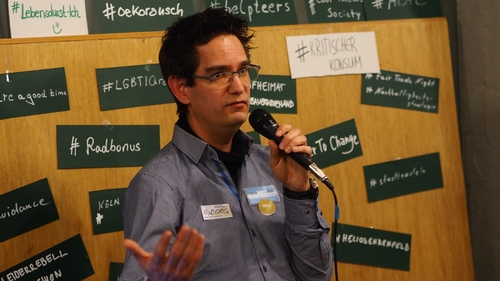 Rafa sprach zum Thema Kritischer Konsum. Er arbeite für den Bund der Deutschen Katholischen Jugend (BDKJ), also „für die Kirche“, die sehr viel Geld ausgebe, etwa für Bettwäsche in Krankenhäusern zu Essen in Schulmensen. „Das sind im Jahr etwa 80 Milliarden Euro.“ Staatliche und kommunale Stellen kämen auf 400 Milliarden Euro. „Das sind also große Geldbeträge, die zusätzlich zu dem, was jeder von uns kauft, institutionell“ ausgegeben würden. Als Referent für Entwicklungsfragen wolle er auf diesen nicht-privaten Aspekt des Gesamtkonsums hinweisen, der auch (wie bei ihm) mit den Gedanken an Fairness und Klimagerechtigkeit stattfinden könne. Da habe man zum Teil auch etwas Einflussmöglichkeit.