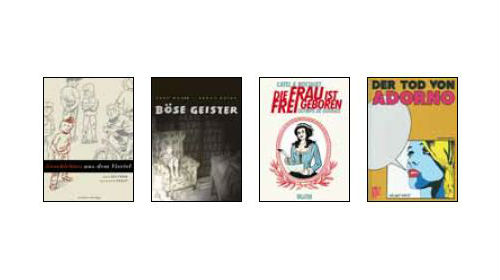 José-Louis Bocquet erzählt de Gouges bewegtes Leben und ihren Kampf für die Gleichberechtigung auf 400 Seiten. Die vielen Personen und politischen wie gesellschaftlichen Hintergründe machen dennoch einen 50seitigen Anhang nötig. Nach dem ungewöhnlichen Frauenportrait „Kiki de Montparnasse“ ist es auch hier Catel Muller, von der die schwungvollen Schwarzweiß-Zeichnungen kommen (Splitter). Außergewöhnlich ist „Der Tod von Adorno“. Helmut Wietz hat den Anfang seines surrealen Agitpop-Art-Comics vor über 40 Jahren für die Aufnahmeprüfung an der Filmschule begonnen und dann liegen lassen. Erst jetzt, im Ruhestand, hat er ihn vollendet. Das semi-autobiografische Werk erzählt vergnüglich und quietschbunt von Studentenbewegung, Zielgruppenfilmen, Pornografie und Adorno im Bundestag (Metrolit). Mit dem vierten Band von „Klezmer“ verfolgt Joann Sfar weiterhin das Schicksal eines Klezmer-Ensembles im Russland des frühen 20. Jahrhunderts. In Odessa angekommen landet die Truppe in einem Zirkus, und Sfar nutzt das Ambiente, noch mehr als bisher das Leben in all seinen Facetten mit wilden Zeichnungen, Liebe und Gewalt zu zelebrieren (avant verlag). Nach Thomas Bernhards „Alte Meister“ nimmt sich Nicolas Mahler nun gleich zwei Vorlagen auf einmal vor: „Alice in Sussex“ verknotet Lewis Carrols „Alice in Wonderland“ mit „Frankenstein in Sussex“ des Österreichers H.C. Artmanns, der ja schon Alice mit Mary Shelleys Monster verband. Also Zitat hoch zwei, was Mahler da in seinem gewohnt trocken-humorigen Minimalismus betreibt (Suhrkamp). „Spiegelstärke“ ist ein 1995 von Marc-Antoine Mathieu konzipiertes Erzählexperiment, das vorne wie hinten begonnen werden kann und in der Mitte zusammenfindet. Es ist der letzte Band der kafkaesken Vexierspiele um den Angestellten Julius Corentin Acquefacques, der nun wieder vorliegt (Reprodukt).