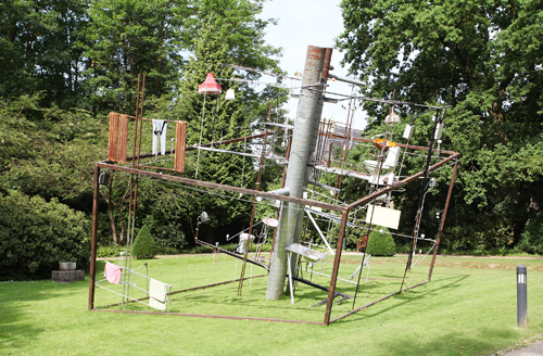 Gerade noch haben sich die Besucher an „Utopia“ erfreut, das ist ein wachsendes Mitmach-Wandbild. Aus Zeitschriften wird ausgeschnitten, geklebt, gepinnt, es wird wachsen, will gedeihen, schnell noch ein Foto vom besonders schönen (weil eigenen) Bildfund für die Collage, dann steht man auch schon in der zentralen Arbeit von Tea Mäkipää im Museum Schloss Moyland: die schicke Ladenstraße „Escape Allee“ (2017). Am Ende ein Fenster, das Wahlfenster, ja die Finnin glaubt an Entscheidungsmöglichkeiten – noch. Schick das „Design for a Nuclear Power Station“ und die alte Frau im ein Quadratmeter großen Altenwohnsitz – aber sie hat eine Wärmflasche. Da ist Sodom und Gomorra und die „Global Charity“ nicht mehr weit. Nehmen Sie Platz auf den Bänken zwischen den Parkleuchten und denken sie an Kapitalismus und Genmanipulationen, und wenn sie Angst haben, schellen Sie an der alten staubigen Haustür, denn dahinter leben sie – die Trump, das Erdogan und der Putin – schellen Sie sich die Seele aus dem Körper, sie werden wie immer nicht gehört. Und doch – Moyland ist DER Ausflug des Sommers.