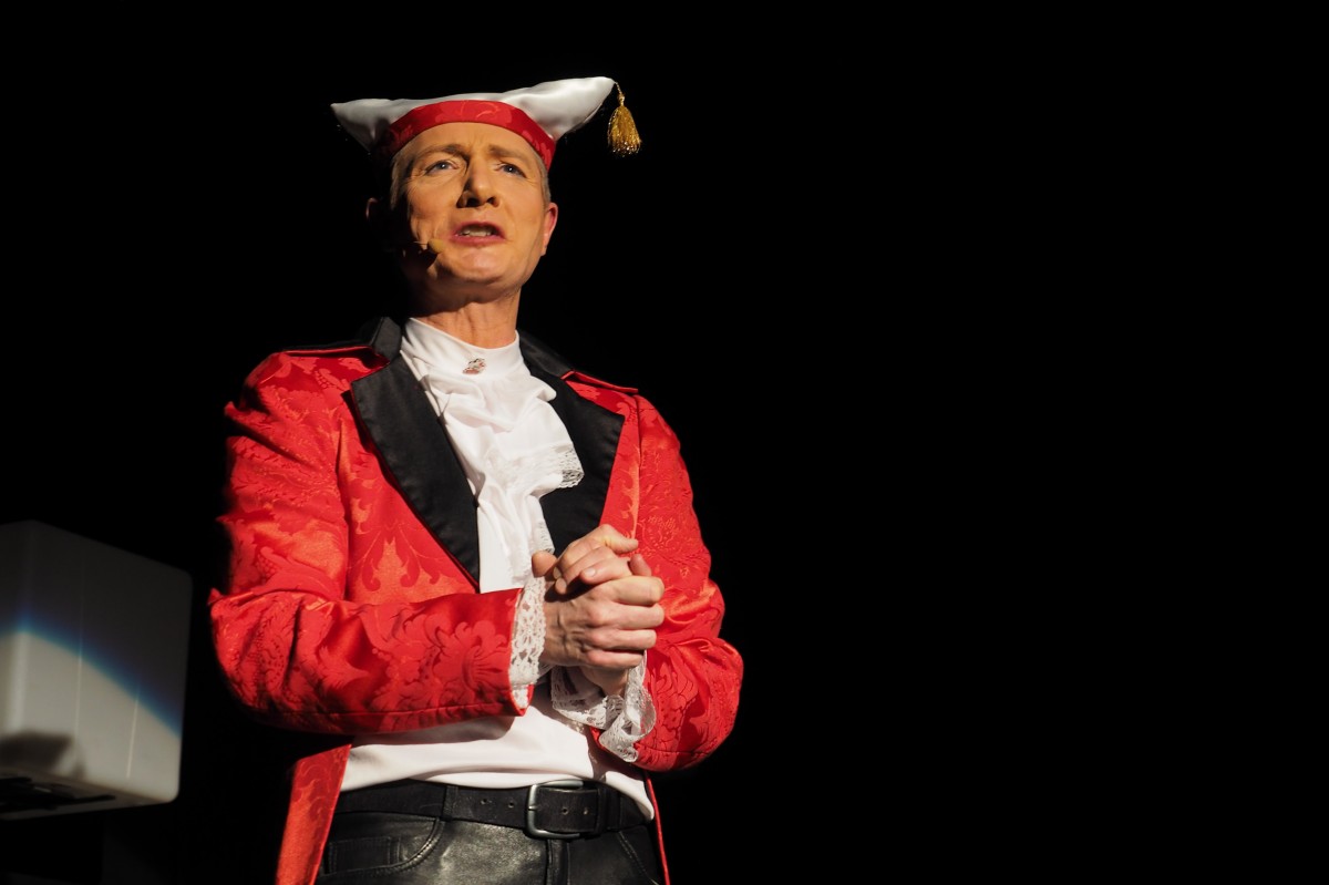 Präsident und Posterboy Christoph Stubbe führt mit frecher, thematischer Moderation durch ein musikalisch umrahmtes Sketch-Programm, an dem er auch selber schauspielerisch teilnimmt. Lustvoll-bissig arbeitet es sich mit politischem Kabarett, Typenkomik, Satire, Märchenbearbeitung und allerlei hintersinniger Albernheit an den letzten 12 Monaten ab, wo nicht an der heutigen Zeit allgemein. Wer medial wiederholt auffällt, muss damit rechnen beim vom Fernsehen beeinflussten Fatal Banal sein Fett weg zu bekommen. Trends und Einstellungen aus dem Politischen oder Privaten, die zum Irrsinn ausufern und moderne Widersinnigkeiten offenbaren, werden zur Pointen-Vorlage. Die Mischung macht’s: Übergänge und offene Grenzen zwischen Moderation, Musik und Theater lassen bei Fatal Banal alles schlüssig unter den Karnevalshut passen, drei Stunden plus Pause ist man unterhalten und fragt sich, warum es auf einmal so spät ist. Die 19 Vorstellungen im Bürgerzentrum Ehrenfeld, wo 240 Jeckinnen und Jecken Platz finden, waren auch in diesem Jahr schnell ausverkauft. Mehr geht nicht, die Beteiligten haben angeblich auch Beruf und Familie!
