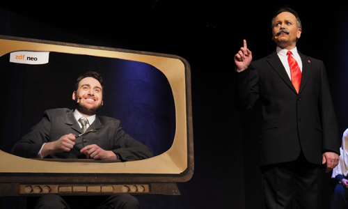 Trumps Wahlsieg und den Beginn seiner Amtszeit konnte der alternative Karnevalsverein noch nicht zufriedenstellend auswerten – vielleicht zum Glück, denn viele Versuche, ihn zu imitieren, gehen (auch bei Fatal Banal) schief. Das sagen zumindest seine Tweets. Umso wichtiger sind das mit „Melania“ und „Ivanka“ (in weißen Fleecejacken) zum Besten gegebene Trump-Lied „(Ich führe jetzt ein) Geiles Leben“ und Trumps Anruf auf dem Handy von Christoph Stubbe mitten in einer Moderation. „Yes, I’m the president of Fatal Banal. Yes, in Ehrenfeld – Field of Honor.“ Trump will angeblich wissen, wie es ist, Präsident zu sein. – Bei Erdogan ist man weiter. Der türkische Präsident (Ernst) wird mit einer kurzen Chronologie des Aufstiegs und der Skandale „gewürdigt“ – in gereimten Dialogen: „Gewählt ham dich 50 Prozent / der Rest dich dann wohl besser kennt“, lautet ein Einwurf von Cem Özdemir (Schubert), den Erdogan aber nicht als echten Türken ansieht. „Freiheit ist ein hohes Gut / das sage ich euch als Regent / Wenn Presse kritisieren tut / gehört sie aber eingeschränkt“. Jan Böhmermann (Tim Müller) tut in dieser Version der Ereignisse mit der türkischen Flagge ordentlich eins auf den Popo kriegen. Kim Jong-un (mit Rakete) und Merkel (mit Merkelraute) müssen sich hier mit Nebenrollen abfinden.