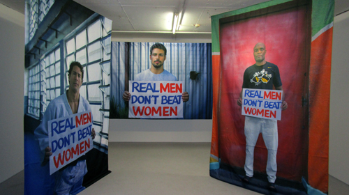 Die zentrale visuelle Installation aber sind großformatige Fotografie-Fahnen von brasilianischen Männern, die darauf alle Tafeln präsentieren: „Real men don´t beat women“. Weltweit ist diese Kampagne auch von Hollywoodgrößen wie Ashton Kutcher, Jamie Foxx und Sean Penn und vielen anderen unterstützt worden. Auch mit unterschiedlichen Sprüchen: „Real men don´t buy girls“. Gleich dahinter sitzen die zwei schwarzenAufanischen Matronen von Museumschefin Marianne Pitzen an einem Tisch. Die keltische Göttinnen, die zur Römerzeit in Bonn verehrt wurden, klagen heute die Weltgemeinschaft an, Frauenleben nicht schützenswert zu finden. Kaum zu glauben: Selbst in Deutschlandist eine sexuelle Handlung gegen den ausdrücklichen Willen einer erwachsenen Person bisher nicht immer strafbar. Nur wenn entweder körperliche Gewalt angewendet wird, mit Gewalt gedroht wird oder eine schutzlose Lage ausgenutzt wird, droht vielleicht das Gefängnis. Einfach nur „Nein“ zu sagen reicht dafür nicht. Kein Wunder, dass nach den Kölner Vorfällen die Verkaufszahlen für Pfefferspray in die Höhe schnellen.