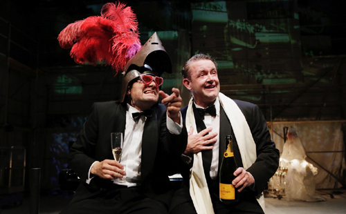 Ecker hat die Geschichte nah an die Kölner Szene und die aktuelle Politik verortet: Vom Kaffeebecher mit „Make Offenbachplatz great again“, der AfD und dem Lehrer Höcke, Trump und den USA, über Alternativen Patriotismus, über vergangene Inszenierungen im Schauspielhaus und der in Köln dringend benötigten „Kohle“, die aus einer Baugrube nebst einem antiken Schädel und einem Römerhelm auf einmal zum Vorschein kommt. Der Bauarbeiter entblättert seinen eingestaubten Flügel und entpuppt sich als der schwungvoll und brillant begleitende Mann am Klavier: Rainer Mühlbach. Er leitet im wahren Leben das Kölner Opernstudio.