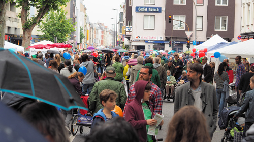 Im Weisshaus-Kino lief um 15 Uhr die Ehrenfelder Dokumentation „Wem gehört die Stadt – Bürger in Bewegung“; 57 Besucher nutzten den freien Eintritt. Zu den aus Sülz kommenden Infoständen zählte eine Willkommensaktion für Flüchtlinge. In Sülz sei die Eröffnung eines Flüchtlingsheims in der Berrenrather Straße im Herbst vorgesehen; zur Vorbereitung und zur Unterstützung der Ankömmlinge würden für unterschiedliche Aufgaben ehrenamtliche Freiwillige gesucht.