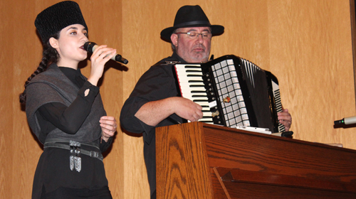 Zunächst aber gaben der Vorsitzende des Vereins, Aykut Sahin, am Akkordeon, und seine beiden Töchtern Adiyef (Gesang) und Janet (Klavier), zwei traditionelle tscherkessische Lieder zum Besten, die von zwei wichtigen Frauenfiguren aus der tscherkessischen Geschichte erzählten. Dann wurde Askarbiy Nagaplevs Dokumentation projiziert, die von einer Übersetzerin im Off mit deutschem Text versehen wurde. Das erwies sich nicht nur für die anwesenden deutschen Zuschauer als hilfreich, auch einige der tscherkessischen Exilanten sprechen mittlerweile eher Türkisch oder Arabisch und sind des Adygeischen oder Kabardinischen nicht mächtig. Nagaplev unterstrich in „Die tscherkessische Frau“ immer wieder die Schönheit und den Scharfsinn, aber auch den Kampfgeist der Frauen seines Volkes. Eigenschaften, die ihnen im Laufe der Jahrhunderte immer wieder von verschiedenen Seiten zugeschrieben wurden. Aber er bebilderte auch ihre weitreichenden Handarbeitsfähigkeiten, vor allem ihre Talente beim Flechten oder Goldsticken, mit denen die Frauen die Ornamente ihrer traditionellen Kleidungen verzieren, die dann als Mitgift in die Ehe gegeben werden. Unter den zahlreichen prominenten Interviewpartnern in Nagaplevs Film befand sich beispielsweise auch der russische Regisseur Alexander Sokurov („Russian Ark“).