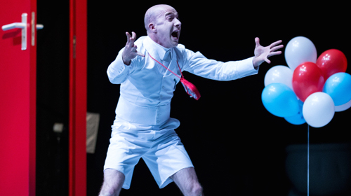 Kindermund tut Wahrheit kund. Schön wär‘s. Victor ist ein kleiner Drecksack, der an seinem Geburtstag schauspielert und chargiert, der mal ehrlich ist, mal lügt – alles im Dienste der Wahrheit. Ganz in weiß gekleidet mit knielangen Hosen sieht er aus wie die leibhaftige Unschuld aus dem Kinderzimmer. Johannes Benecke mit Krähstimme lässt dieses altkluge, minderjährige Monster („ich bin schrecklich intelligent“) zu einer Art bürokratischen Terroristen werden, der mit kalter Berechnung und anarchistischem Elan alle bürgerlichen Gewissheiten unterläuft. Das Dienstmädchen sitzt im Rollstuhl und muss für Victors Vasendesaster geradestehen; er entlarvt den Seitensprung seines beflissen-nachsichtigen Vaters Charles (Jakob Leo Stark) mit der matronenhaften, in Orange gekleideten Therese (Sabine Orleans), klaut dem General (Philipp Pleßmann) die Pistole und lässt ihn in Unterhose paradieren.
