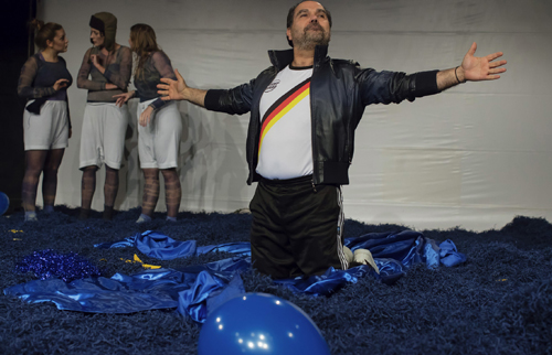 Die große Sause ist vorbei. Im Hintergrund auf der Videoleinwand sieht man noch kurz das Portrait Adenauers, der sich hier, auf der Aachener Straße, gut als Ahnherr eines geeinten Europa verkaufen lässt. Die gute alte Zeit. Sein Gesicht wird schnell überblendet: Euros fließen, Bürger revoltieren, Flüchtlinge stehen vor geschlossenen Grenzen. Doch auf der Bühne erwacht der Chor. Auf einem azurblauen Konfetti-Teppich befreit sich das Trio (Lisa Sophie Kusz, Stephanie Meisenzahl, Stella Veinoglou) mühsam aus ihren Zellophan-Zwangsjacken. Die Krise ist allgegenwärtig, stellt der Chor fest. Nur was tun?