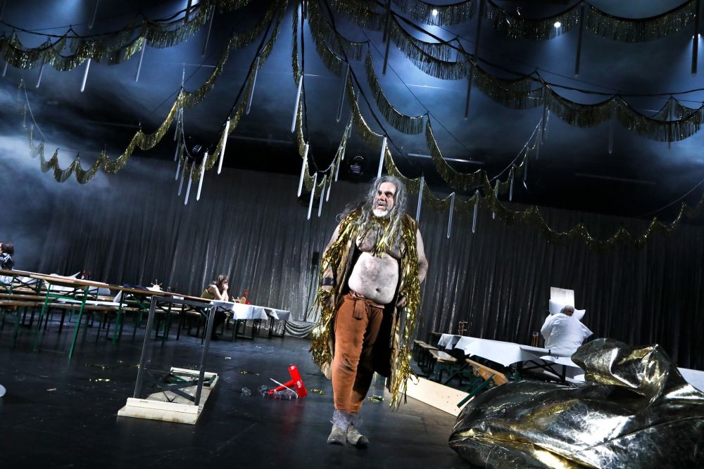 Sie sind sehr alte Freunde, vertrauen sich blind und treffen sich so oft sie können: Der alte Mann und der Alkohol. Sir John Falstaff säuft wie ein Loch, ist also Voll-Alkoholiker. Selbstverständlich versagt sich Bruno Cathomas im kackschleimfarbenen Strampelanzug jede Form von Sucht oder Delirium. Es geht um idealisiertes Spaßsaufen – was zu einer Stadt, die Trinken als Brauchtum begreift, passt. Falstaff empfängt in seiner Stammkneipe, die aussieht wie ein weihnachtlich abgeranzter Karnevalssaal. Unter Goldlametta steht Bierbank an Bierbank, vorne ´ne Schwemme, hinten ´ne Schwemme, links die Kapelle, rechts ein Rednerpult (Bühne: Moritz Müller). Die Kneipenatmo auf der Bühne des Depot 1 bleibt während der Generalprobe noch ein wenig steril, auch wenn es Freibier (und Brezeln) fürs Volk gibt. Neben Cathomas als dröhnendem, lügendem, schamlosen Falstaff bleiben Justus Maiers Pistol und Peter Knaacks Wirtin Quickly etwas blass. Dafür gewinnt Katharina Schmalenbergs Prinz Hal scharfe Kontur als dürrer, wortmächtiger, ironischer Kronprinz, der zwar mit Falstaff säuft, ihn aber bei einem fingierten Raubzug gnadenlos reinlegt und bloßstellt.